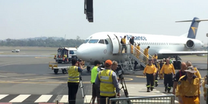 Gladstone Airport gives visiting NSW firefighters a special welcome, with a water cannon salute. The group of 100 will head down to Agnes Water to help fight the Deepwater blaze.